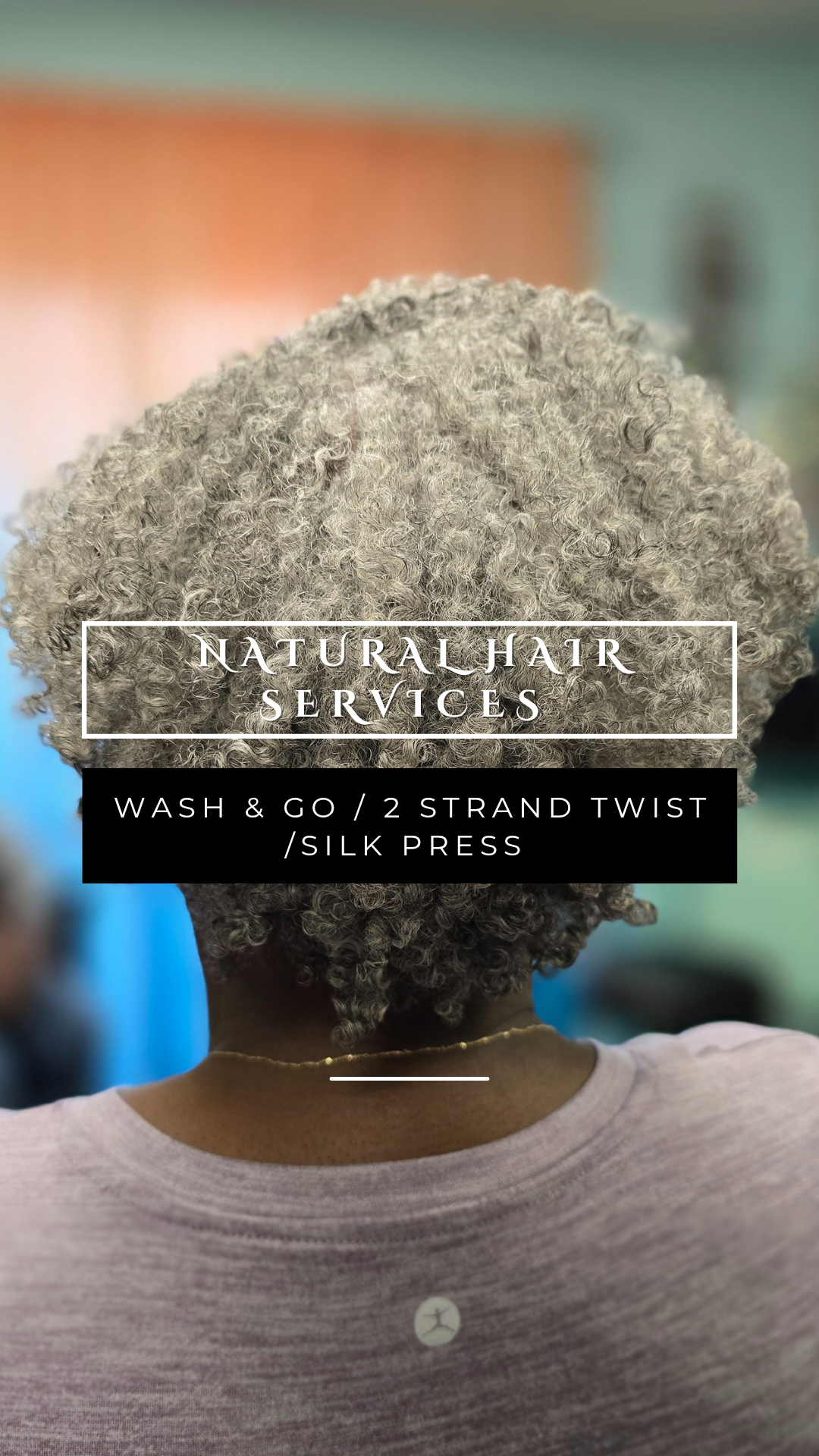 Cleansing, strength and hydration treatments, Thryvia Wash & Go styling, two-strand twists, flat twists, silk presses, color, custom haircuts, and precision afro shaping for textured hair.