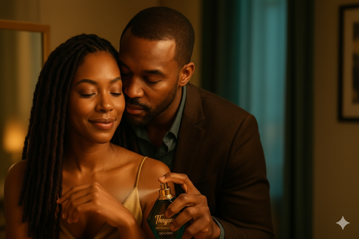 A quiet warmth rises when Thryvia meets the senses — soft, golden, and familiar, like the moment day leans gently into the dusk.